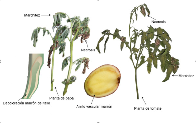 En cuanto a la patata, ambas bacterias afectan a este cultivo pudriéndolo o marchitándolo. Por su parte el tomate se ve afectado únicamente por Ralstonia solanacearum, no por Clavibacter sepedonicus.