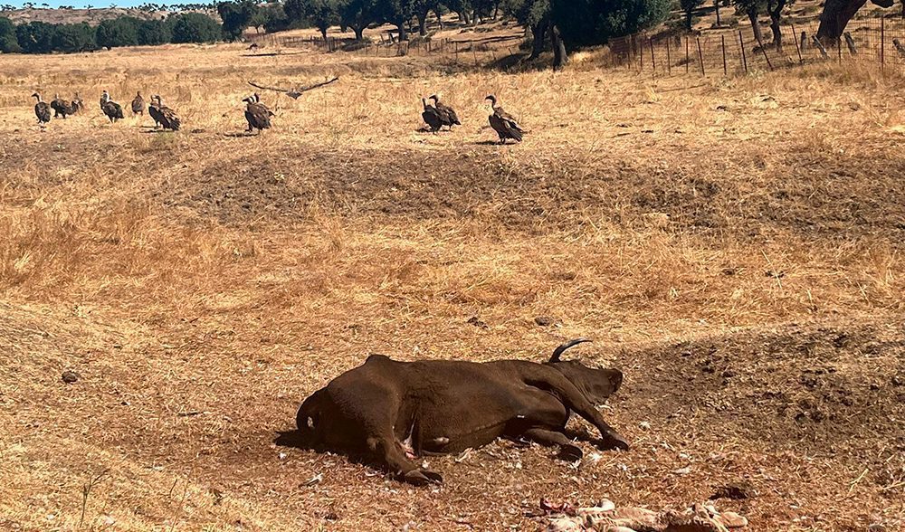El ganadero aclara que había “centenares de buitres” cuando llegó por la mañana y el resto del ganado “estaba asustado”. “Cuando me estaba acercando a la finca, ya vi sobrevolar muchísimos y es que se estaban comiendo al ternero y a la vaca que estaba pariendo. Es increíble el número de buitres que había”, asegura. El afectado augura unas perdidas de, al menos, 2.000 euros por la muerte de las dos reses.