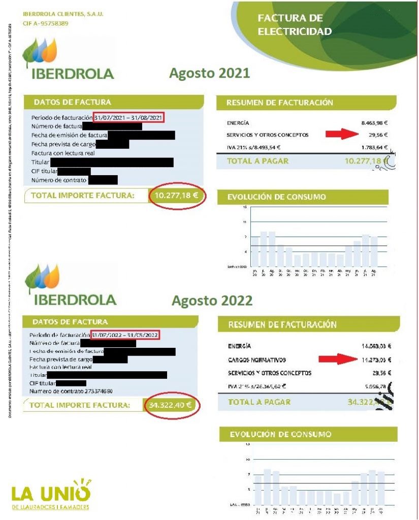 Unión de Uniones ha revisado facturas a nivel estatal en distintas actividades que requieren un consumo importante de electricidad (comunidades de regantes, vacuno de leche, avícola, porcino, etc.) y señala que la proporción del tope del gas ha supuesto entre el 25,5% y hasta el 41,6% de la factura en julio y agosto en los casos analizados.