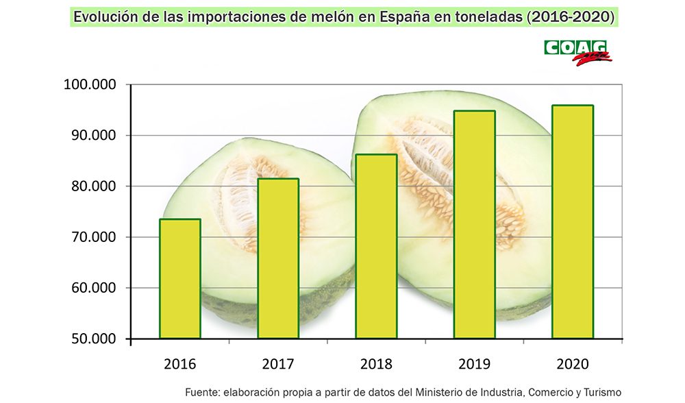Las importaciones de melón a nuestro país han crecido un 31% entre 2016 y 2020, pasando de 73.401 toneladas hasta las 95.792 del pasado año. Se producen dos periodos de importación intensiva por parte de los operadores: en los meses de marzo y abril (con alrededor del 25% total anual importado), momento en el que está comenzando nuestra campaña, y luego en los tres últimos meses del año, cuando comienzan a decaer los volúmenes comercializados de nuestra producción.