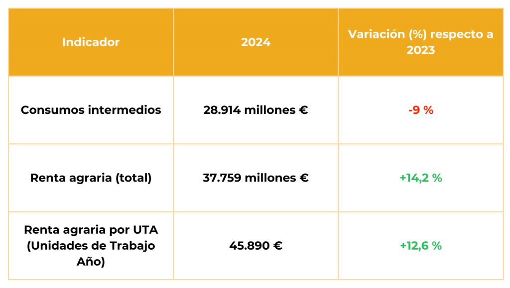 Entre los principales factores que explican esta evolución se encuentran la disminución de los costes de producción y el incremento del valor de la producción de la rama agraria, hasta alcanzar su valor histórico más alto, 68.430 millones de euros.