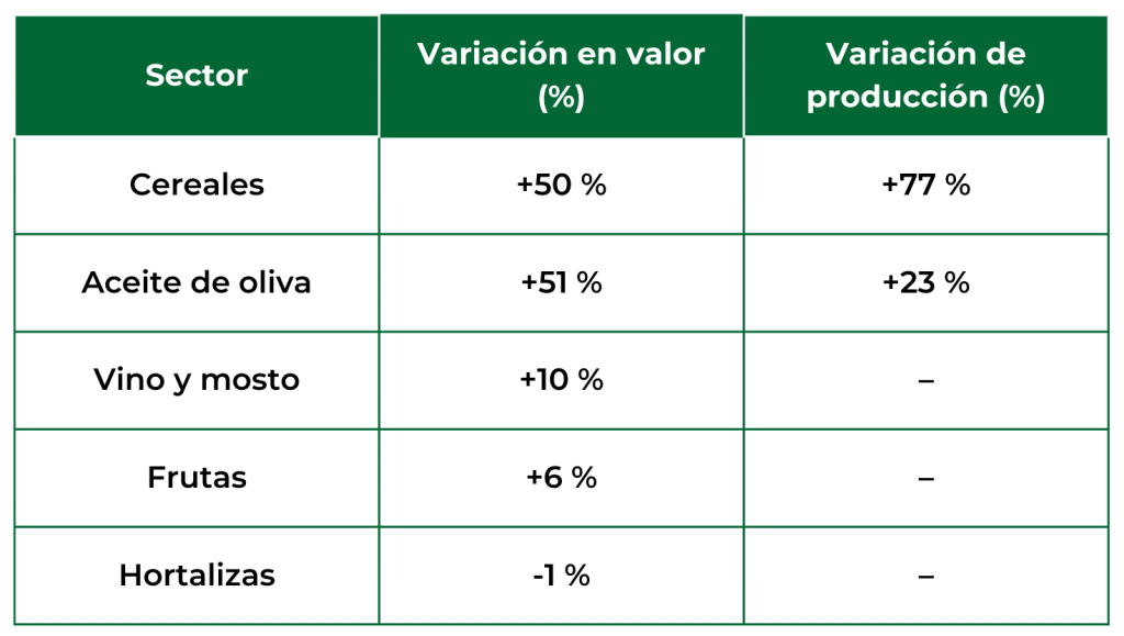 Los cereales han experimentado un aumento de un 50% en valor, fruto de la recuperación de la producción -que ha aumentado un 77%-, tras la fuerte sequía de 2022 que supuso un descenso de la cosecha cayendo a niveles históricos.