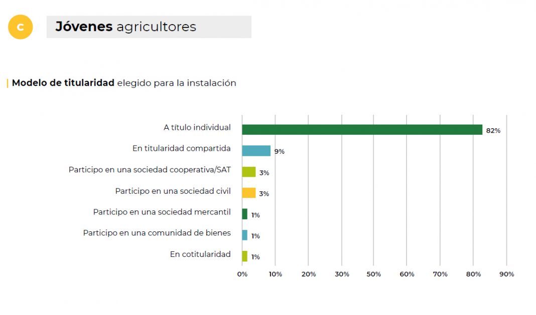 Un 3% participará en una sociedad cooperativa/SAT y otro porcentaje similar en una civil, mientras que la cantidad similar restante se divide a partes iguales en sociedad mercantil, comunidad de bienes y en cotitularidad.