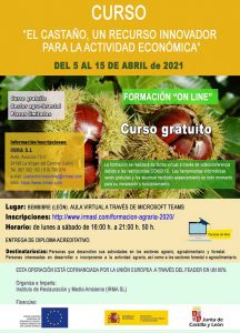 El Instituto de Restauración y Medio Ambiente (IRMA) ha programado el curso ‘El castaño, un recurso innovador para la actividad económica’ del 5 al 15 de abril en Bembibre, en aula virtual a través de Microsoft Teams. El horario será de lunes a sábado, de 16 a 21 horas. El curso es gratuito.