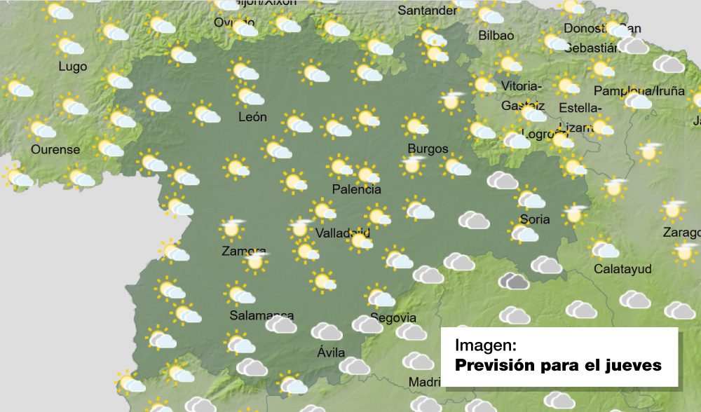 En el norte de Castilla y León se presenta nubosa la jornada de hoy según las previsiones de la Agencia Estatal de Meteorología (Aemet). No se descartan precipitaciones débiles en el entorno de la Cantábrica. En el resto, intervalos de nubes altas. Temperaturas mínimas sin cambios o en ascenso ligero, y máximas sin cambios en el noreste y en ascenso en el resto. Vientos del noreste y este.