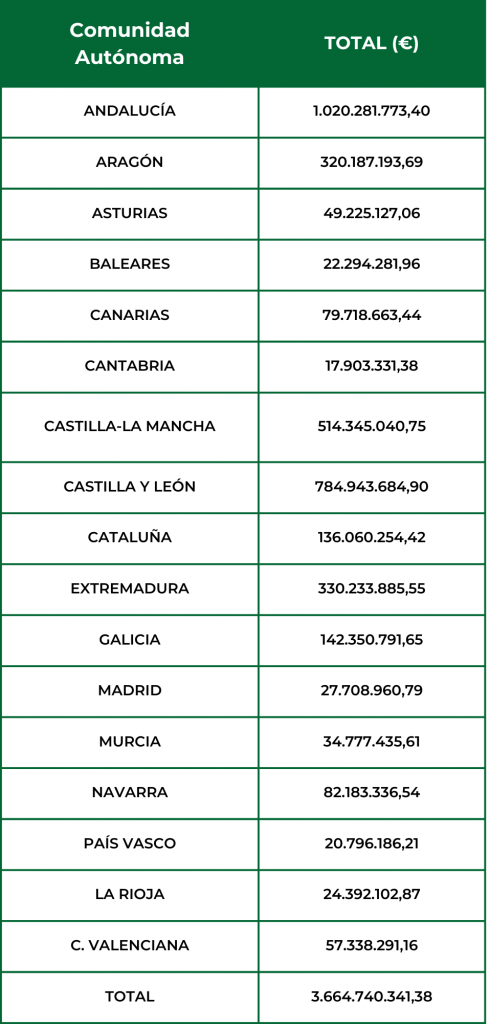 En la tabla que se muestra a continuación, se ve reflejada la distribución por comunidades autónomas de los pagos ya realizados de las ayudas directas de la campaña 2024. Estos pagos incluyen, tanto los pagos anticipados como los pagos del saldo del periodo ordinario realizados hasta final de año.