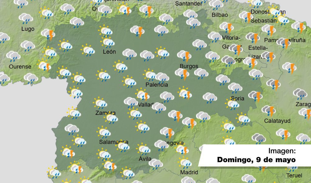 El domingo amanecerá nuboso o cubierto con precipitaciones, que se irán extendiendo de oeste a este durante el día. Localmente pueden ir con tormenta, persistentes en algunas comarcas de la mitad oeste. Cota de la nieve a 2.000 metros, bajando a 1.500. Temperaturas en descenso, ligero en las mínimas y notable en las máximas. Vientos del sur al suroeste con rachas fuertes, y muy fuertes en zonas altas.
