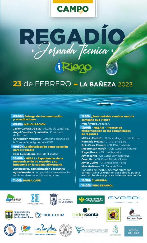 La revista CAMPO organiza el 23 de febrero, en La Bañeza, una Jornada de Regadío en la que se analizará el papel del agua en la agricultura leonesa, además de explorar fórmulas para realizar una actividad más eficiente y más rentable.