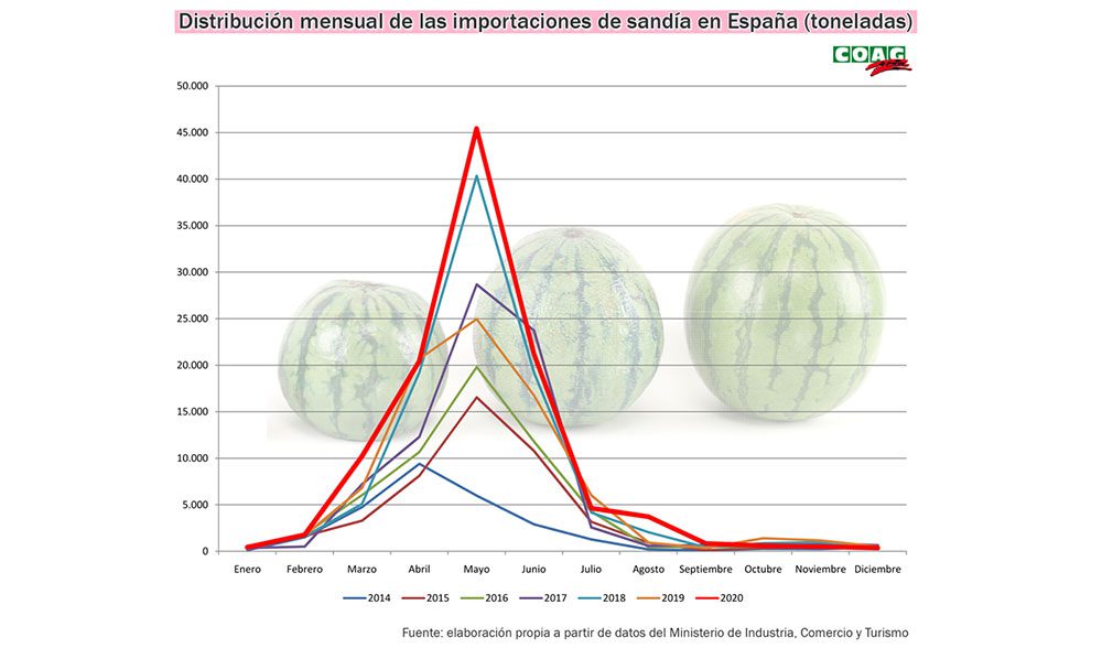 Las importaciones de sandías a nuestro país se han multiplicado casi por 9 durante el último lustro, al pasar de 10.572 toneladas en 2014 hasta las 88.603 tonelada del pasado año. Así se desprende el estudio elaborado por la organización agraria COAG ante el inicio de la campaña de sandía en el sureste español, que destaca especialmente la entrada de este producto coincidiendo con la salida de las primeras sandías españolas al mercado.