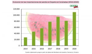 Por países destaca especialmente la procedencia de Marruecos: en 2020 supusieron el 81% del total de sandias importadas, seguidas a gran distancia por las de Senegal (10%) y Brasil (1,8%). Este producto tiene liberalizada su entrada a la Unión Europea por los acuerdos comerciales entre la UE y Marruecos. “Lo denunciamos en su momento. Es caldo de cultivo para la especulación de multinacionales euro-marroquís. Acabamos engordando la cuenta de resultados de unos pocos a costa de sacrificar el futuro de nuestros agricultores”, ha recordado Góngora.