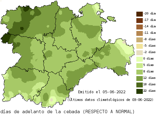 En el caso del trigo el adelanto es de doce días en la mayor parte de la comunidad, aunque en algunos lugares ese adelanto no es tan marcado. Por ejemplo en el sur y el este de Salamanca, el extremo sur de Valladolid y parte de la provincia de Ávila.