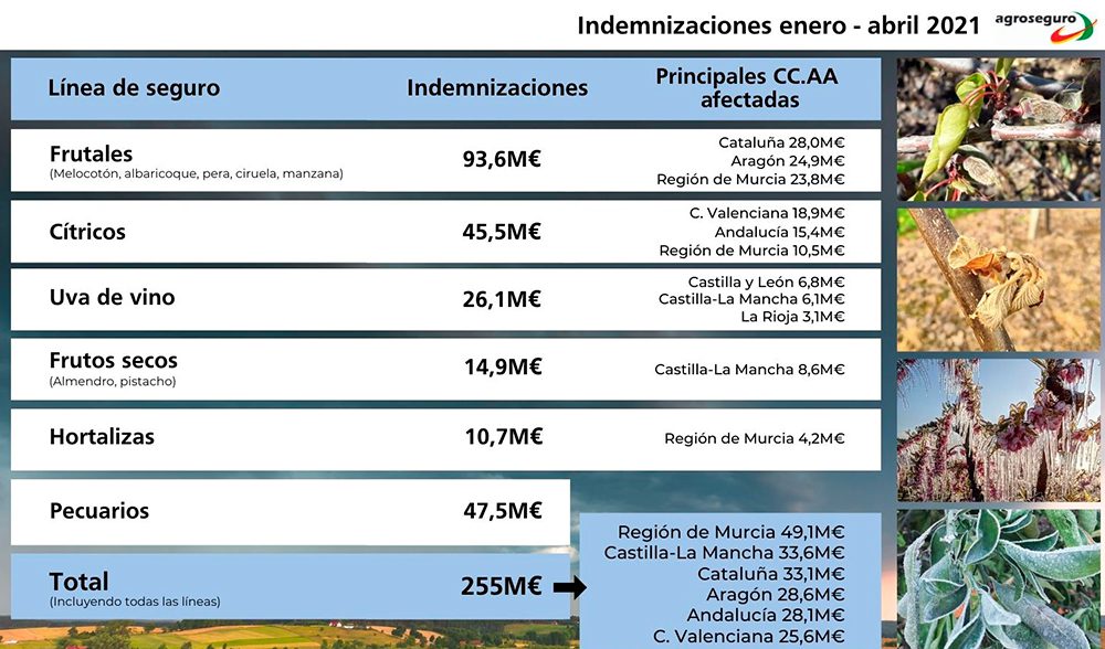 A este inicio tan complicado de año se une la incertidumbre que provoca la llegada de la primavera y el verano, cuando las tormentas de pedrisco se vuelven más frecuentes e intensas. En 2020, el pedrisco generó 227 millones de euros en indemnizaciones para los agricultores asegurados. En concreto, las producciones de fruta dulce agrupadas bajo la línea de seguro de frutales (melocotón, albaricoque, pera, ciruela y manzana) registraron 89,9 millones. La uva de vino y los cultivos herbáceos acumularon daños por valor de 33,5 y 28,8 millones, respectivamente. Además, los cítricos y el conjunto de las hortalizas se situaron entorno a los 20 millones cada uno, aproximadamente. Es importante destacar que en el periodo comprendido entre el 7 de abril y el 30 de agosto se recibieron a diario siniestros producidos por pedrisco.