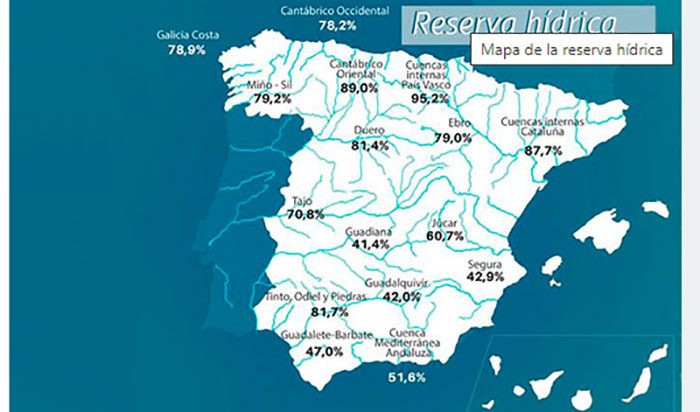 La reserva hídrica española está al 63,1% de su capacidad total. Los embalses almacenan actualmente 35.250 hectómetros cúbicos de agua, disminuyendo en la última semana en 128 hectómetros cúbicos (el 0,2% de la capacidad total actual de los embalses).