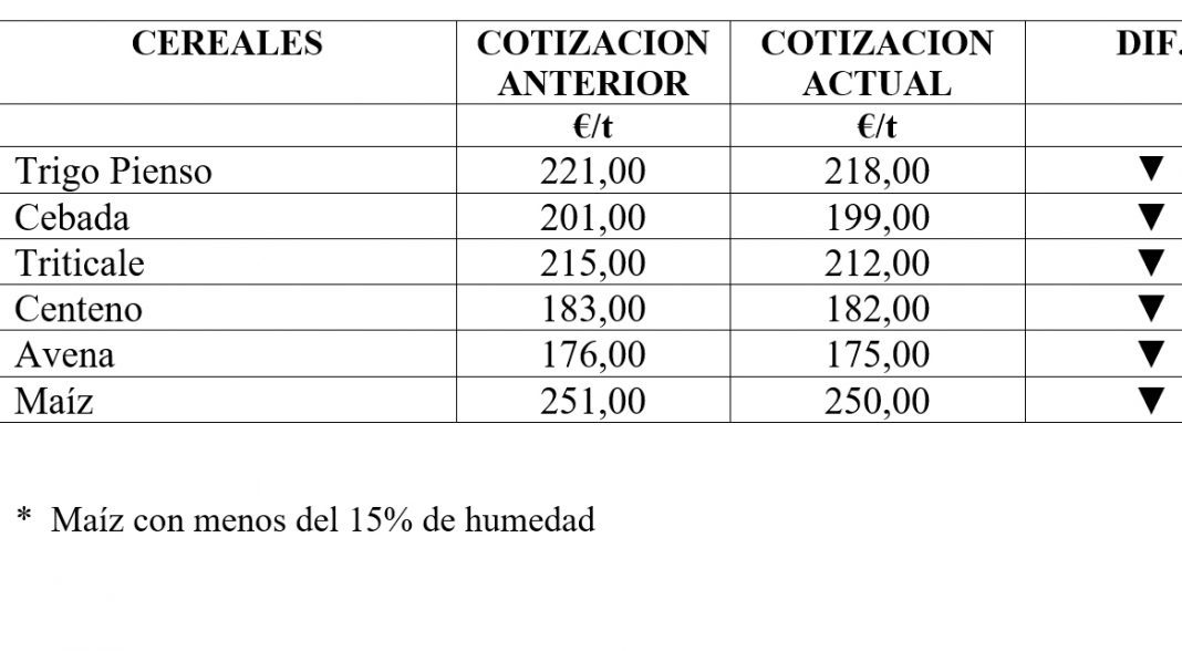 | Trigo Pienso | 221,00 | 218,00 | ▼ |