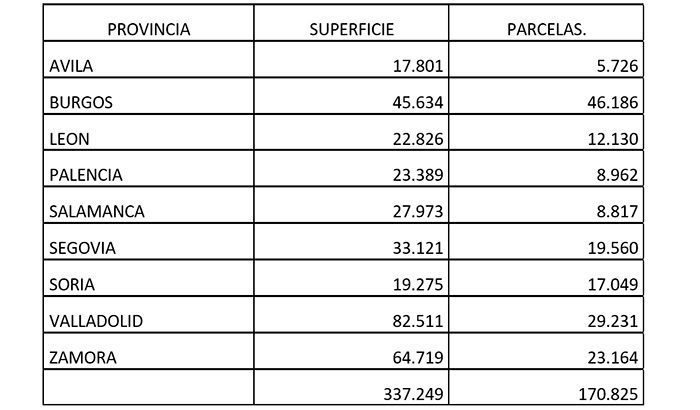 La provincia de Burgos es la que cuenta con mayor número de parcelas afectadas, con 46.186, seguida por la de Valladolid, con partes relativos a 29.231.