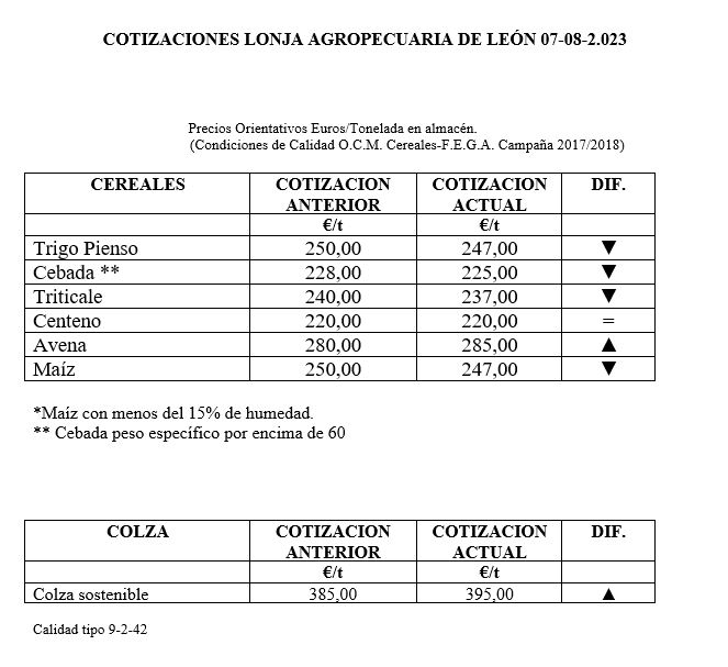 Según los datos, el precio del trigo, de la cebada, del triticale y del maíz se han situado 3 euros por debajo del coste de pasada semana, mientras que el precio del centeno se mantiene estable.
