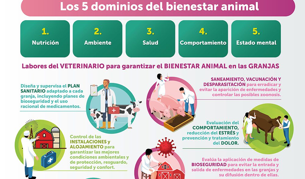 La Organización ha elaborado una infografía en la que resume las principales funciones de los veterinarios en las granjas de producción para garantizar el bienestar de los animales, que comienza por la elaboración de un plan sanitario específico de cada explotación, que incluye planes de bioseguridad para evitar la entrada y diseminación de enfermedades dentro de las granjas y el uso racional de medicamentos, que en el caso de los antimicrobianos se ha reducido un 59 por ciento entre 2014 y 2018.
