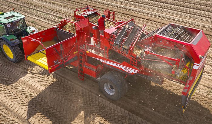 La Evo 290 es quizá la máquina más delicada en su trato con la patata. Es “la hermana mayor”, la arrancadora de dos hileras más grande del mercado. Es equivalente a la SE 75-55, pero con una tolva de nueve toneladas. Sus dimensiones llevaron a diseñarla con una peculiaridad: dispone de tres ejes, dos ruedas en el lado izquierdo y una en el derecho, para poder trabajar sin que la máquina se hunda en la tierra.