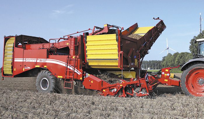En la SV el canal de limpieza es absolutamente recto, con una noria que eleva las patatas hasta la mesa de inspección. Está concebida para suelos muy preparados, a ser posible con una cribadora como la Combi Star, ya que limpia poco el producto y, a cambio, lo cuida de forma exquisita. “Porque está verificado que todas las máquinas de Grimme, incluso las de mayor limpieza, tratan bien al producto”.