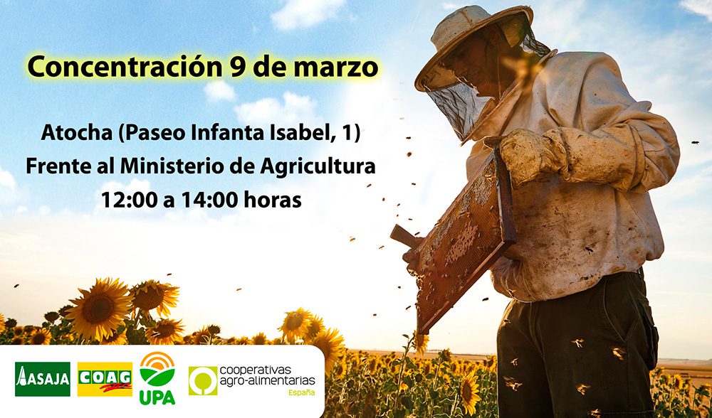 Apicultoras y apicultores de toda España, convocados por Asaja, COAG, UPA y Cooperativas Agroalimentarias de España, se concentrarán en Madrid, frente al Ministerio de Agricultura, Pesca y Alimentación el 9 de marzo, a las 12,00 horas, para visibilizar los problemas por los que atraviesa la producción y comercialización de la miel española y pedir la puesta en marcha de un conjunto de medidas ante la grave crisis que atraviesa la apicultura, y que afecta a más de 36.0000 familias en nuestro país.