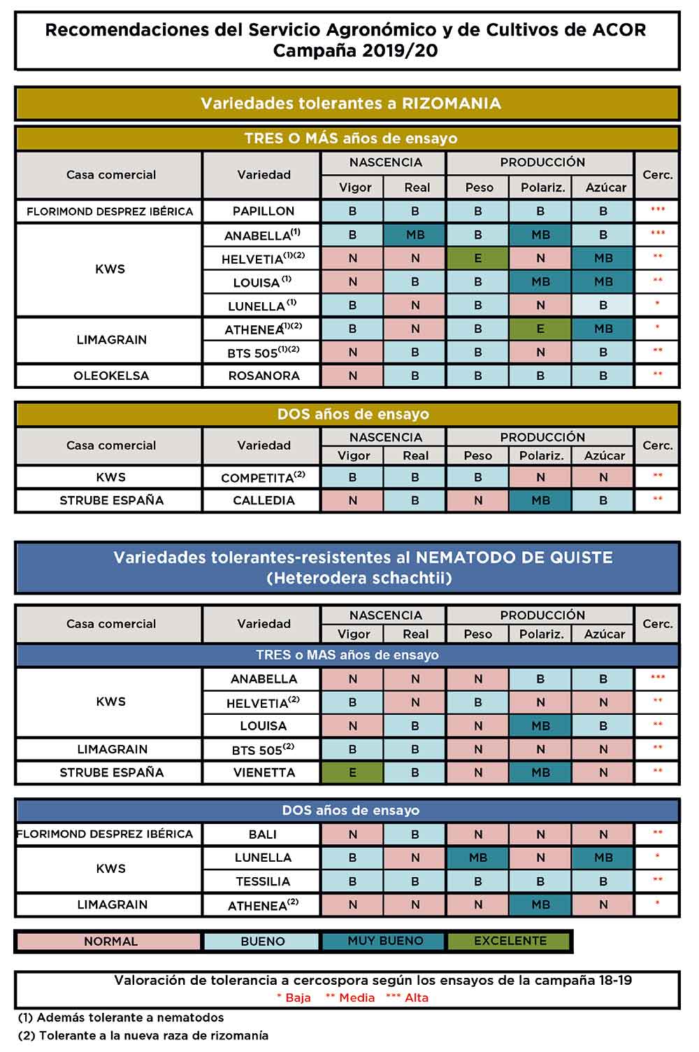 La cooperativa Acor acaba de hacer pública su recomendación de variedades de remolacha para las siembras esta primavera, que incluye como novedad una valoración de tolerancia a cercospora de las distintas opciones, según los resultados obtenidos en los ensayos llevados a cabo en la campaña pasada (2018-2019). Como señalan desde el Servicio Agronómico y de Cultivos, la cooperativa mantiene una red de ensayos de variedades en toda Castilla y León “con el fin de que el socio tenga toda la información necesaria para llevar a cabo el cultivo con la mejor producción y beneficio posible”.