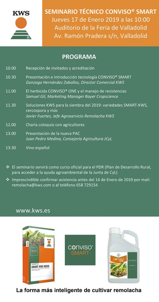 La Feria de Valladolid acoge el 17 de enero un seminario de presentación del sistema CONVISO SMART, que combina el herbicida del grupo ALS CONVISO ONE, de Bayer, con variedades de remolacha KWS tolerantes a este producto.