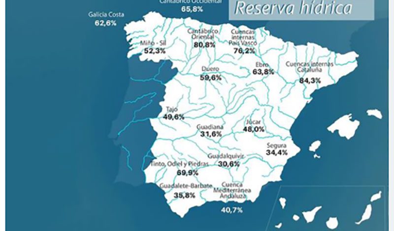 La reserva hídrica española está al 47,0 por ciento de su capacidad total. Los embalses almacenan actualmente 26.274 hectómetros cúbicos de agua, disminuyendo en la última semana en 131 hectómetros cúbicos (el 0,2% de la capacidad total actual de los embalses).