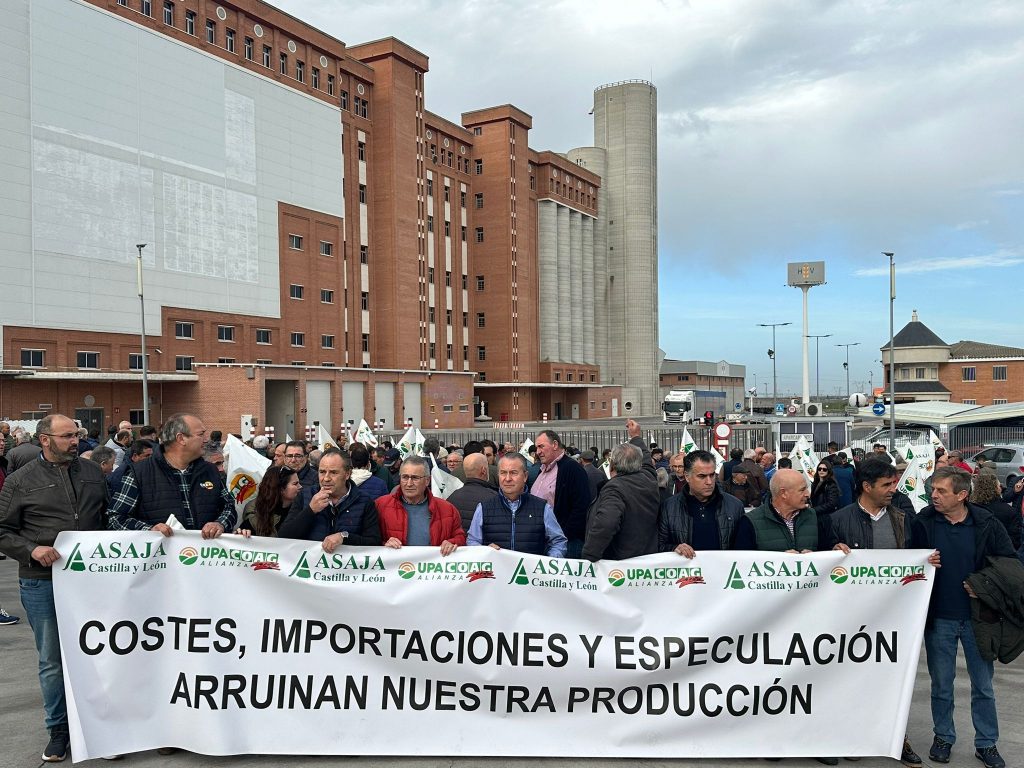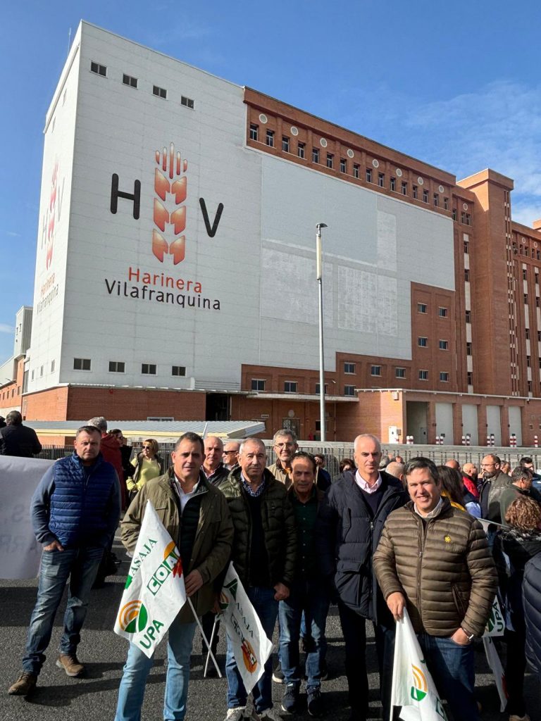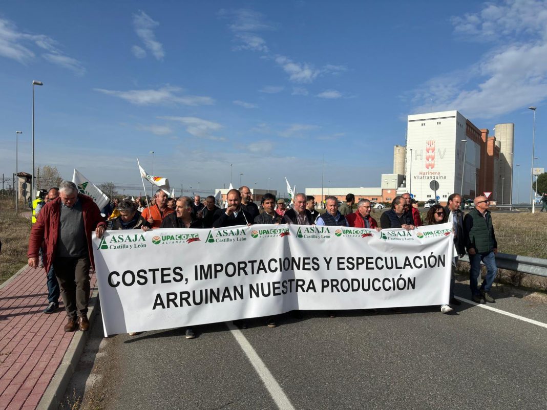 La concentración ha tenido lugar ante la Harinera Vilafranquina y posteriormente se ha realizado una marcha hasta las instalaciones del mayorista de cereales Octaviano Palomo, bajo el lema ‘Costes, importaciones y especulación arruinan nuestra producción’.