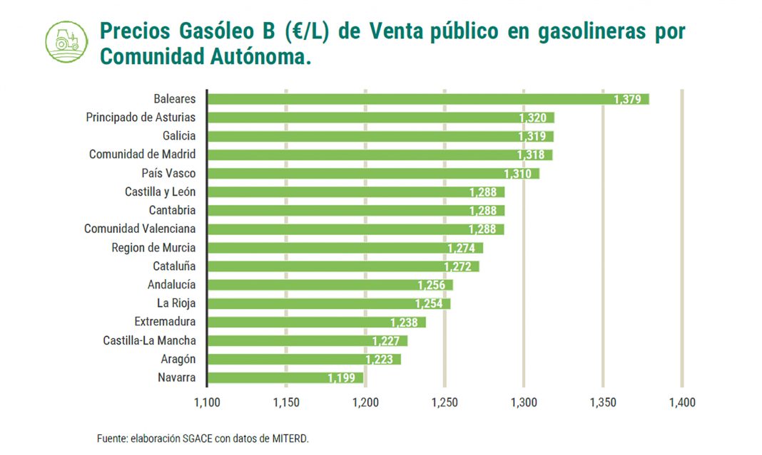 El Ministerio de Agricultura, Pesca y Alimentación ha hecho público un informe de la Agencia Internacional de la Energía según el cual Baleares, Asturias y Galicia tienen el gasóleo agrícola más caro de España.