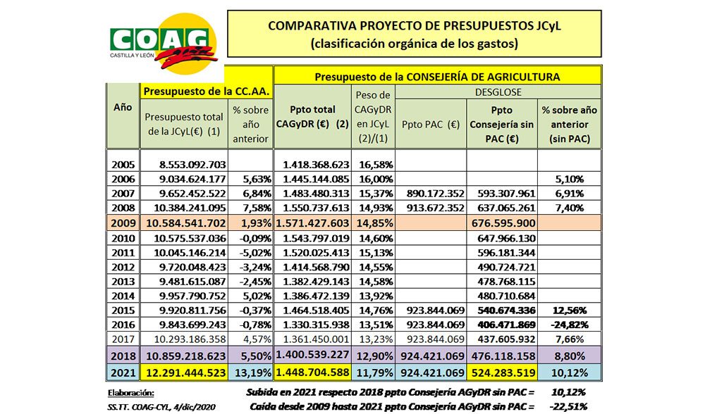 COAG Castilla y León asegura comprender la complejidad de la situación que está afectando a toda la sociedad, y valora el incremento del presupuesto global de la Junta, especialmente en las políticas sociales como Sanidad, Educación y Servicios Sociales. No obstante, el sector agrario tampoco ha sido ajeno a la crisis, particularmente por la incidencia del cierre del canal Horeca; y pese a ello la agricultura ha estado y está a la altura de las circunstancias cumpliendo con su compromiso con la sociedad. Por ello la pregunta que se hacen desde la organización agraria es si la Junta se ha volcado presupuestariamente también con la Consejería de Agricultura.