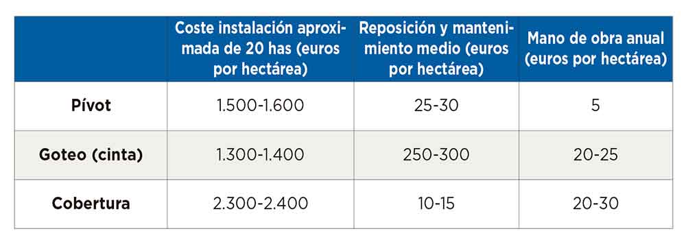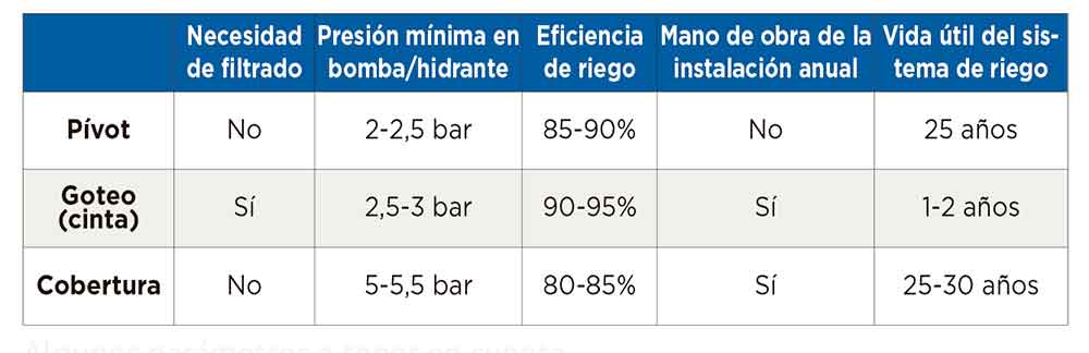 Al hacer un análisis de costes para diferentes sistemas de riego -como pueden ser pívot, riego por goteo y aspersión con cobertura total- van a influir algunos parámetros: