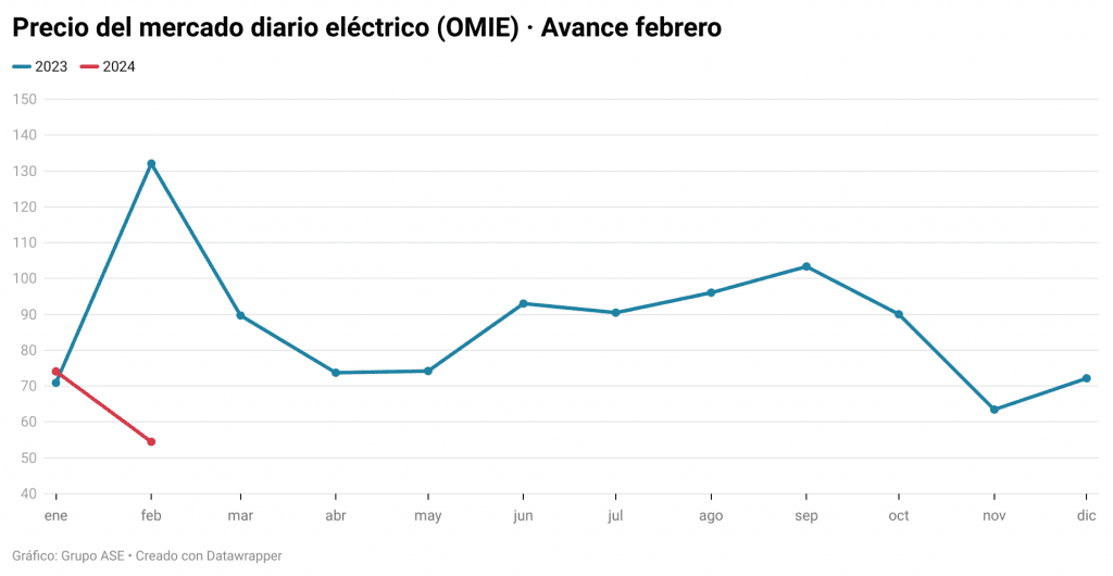El precio diario del mercado mayorista (POOL) español de febrero se sitúa en 54,48 €/MWh a 15 de febrero. Ha bajado un 26,5% respecto a enero y es un extraordinario 58,7% más barato que hace un año.
