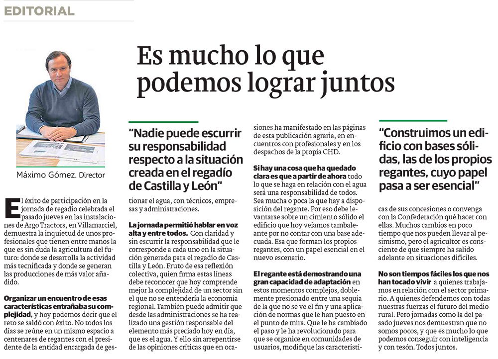 La jornada permitió hablar en voz alta y entre todos. Con claridad y sin escurrir la responsabilidad que le corresponde a cada uno en la situación generada para el regadío de Castilla y León. Fruto de esa reflexión colectiva, quien firma estas líneas debe reconocer que hoy comprende mejor la complejidad de un sector sin el que no se entendería la economía regional. También puede admitir que desde las administraciones se ha realizado una gestión responsable del elemento más preciado hoy en día, que es el agua. Y ello sin arrepentirse de las opiniones críticas que en ocasiones ha manifestado en las páginas de esta publicación agraria, en encuentros con profesionales y en los despachos de la propia CHD.
