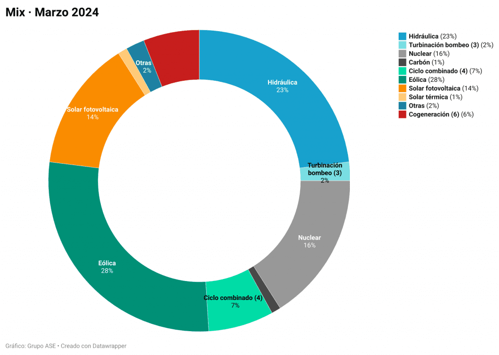 La producción renovable ha cubierto el 67,6% del mix de generación en marzo, fulminando el récord que había establecido el mes pasado (61,7%). Ha sido gracias al extraordinario aumento de la generación hidráulica, que ha crecido un 141,6% respecto a hace un año. La eólica se redujo un 9% y la fotovoltaica se contrajo un 1,7% por la menor radiación solar y quizá también por el aumento de los vertidos técnicos y económicos, aunque no disponemos de datos concretos.