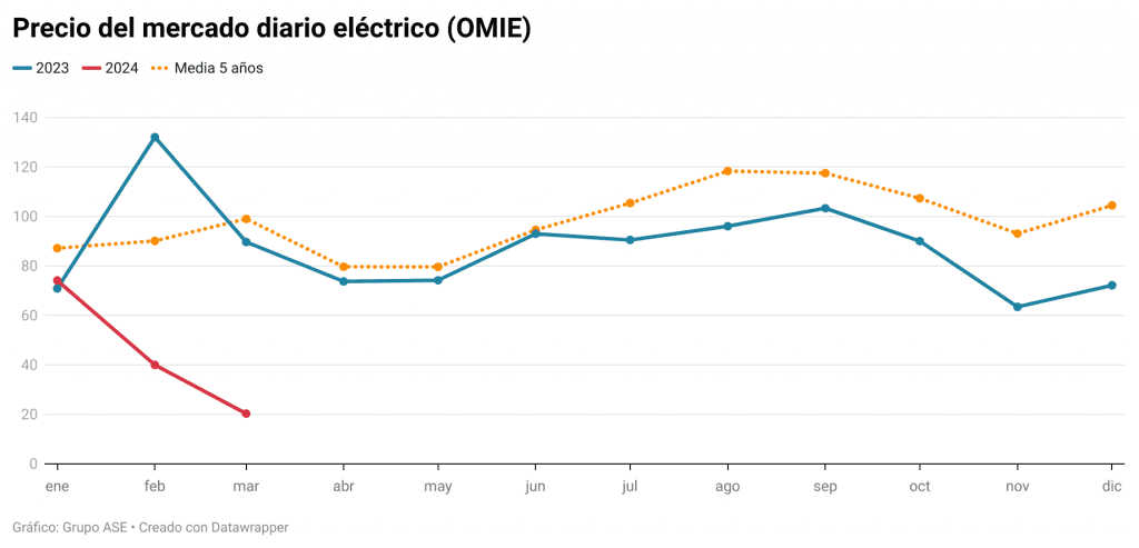 El precio diario de marzo en el mercado mayorista español (POOL) ha cerrado en 20,31 €/MWh. Baja un 49% respecto a febrero y se desploma un 77,4% en comparación con su nivel hace un año (89,70 €/MWh). Los analistas de Grupo ASE señalan que hay que remontarse a los meses más duros de la pandemia, hasta abril de 2020 (17,65 €/MWh) para encontrar un precio más bajo.