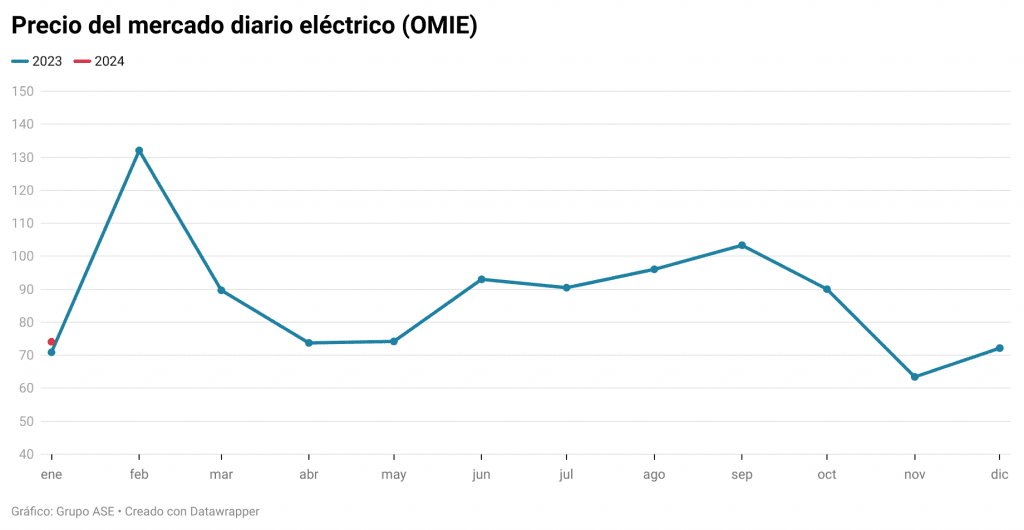 El precio diario del mercado mayorista de electricidad español (POOL) de enero se sitúa en 74,10 €/MWh. Sube un 2,7% respecto a diciembre y es un 4,5% más caro que hace un año.