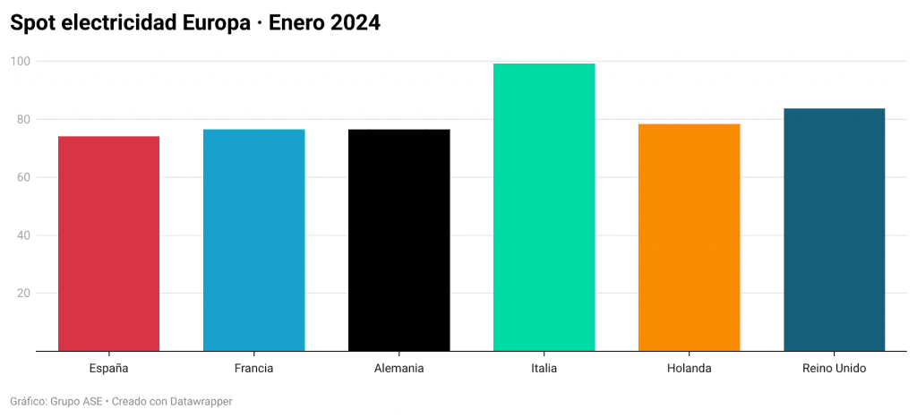 El precio español (74,10 €/MWh ha sido ligeramente más competitivo que el francés (76,59 €/MWh) y que el alemán (76,57 €/MWh). Frente a Italia (99,16 €/MWh) sí es mucho más bajo.