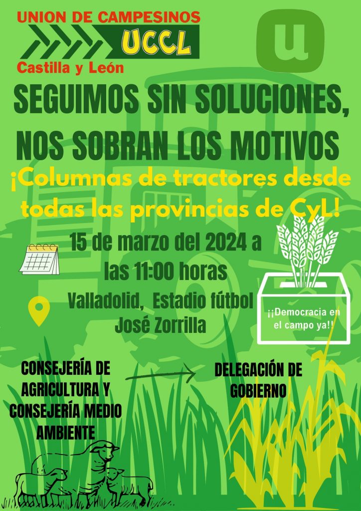En la misma comunidad autónoma, las calles de Valladolid recibirán el viernes 15 de marzo una nueva tractorada, convocada por UCCL, la rama local de la Unión de Uniones.