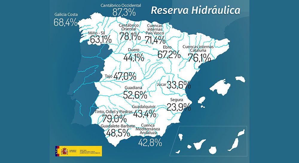 La reserva hidráulica española está al 50,5% de su capacidad total. Los embalses almacenan actualmente 28.242 hectómetros cúbicos (hm³) de agua, disminuyendo en la última semana en 550 hectómetros cúbicos (el 1 por ciento de la capacidad total de los embalses). En el Duero la reserva se encuentra al 44,1%.