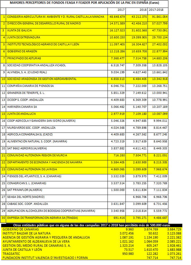 En cuanto a entidades públicas instrumentales, el Instituto Tecnológico Agrario de Castilla y León, con 27,4 millones de euros y la Sociedad Aragonesa de Gestión Agroambiental con 13,3 millones son las que aparece en los puestos quinto y décimo.