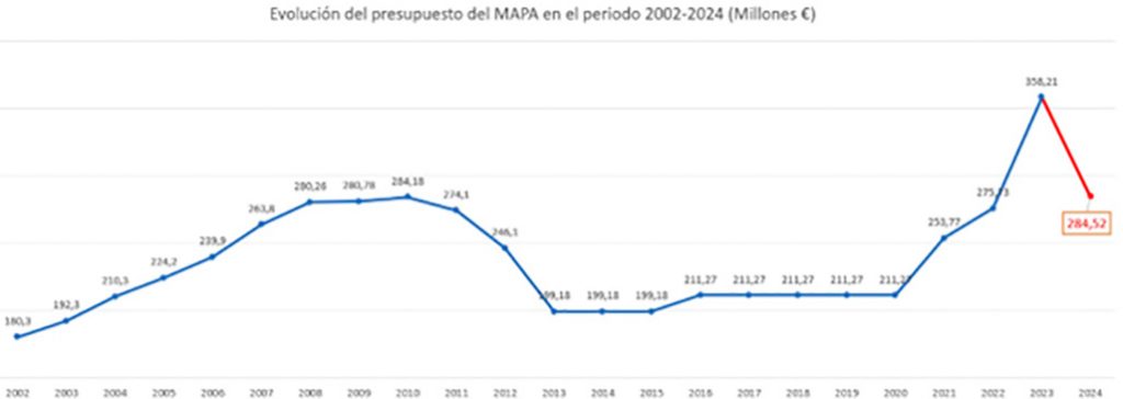 “El Ministerio de Agricultura ha hecho oídos sordos a las peticiones del sector y, obviando los efectos del cambio climático en el campo, ha metido un tijeretazo del 21% en el presupuesto de seguros para 2024, al pasar de los 358 millones del 2023 a los escasos 284 para el nuevo año”, ha subrayado Pedro García, responsable de Seguros Agrarios de la organización.