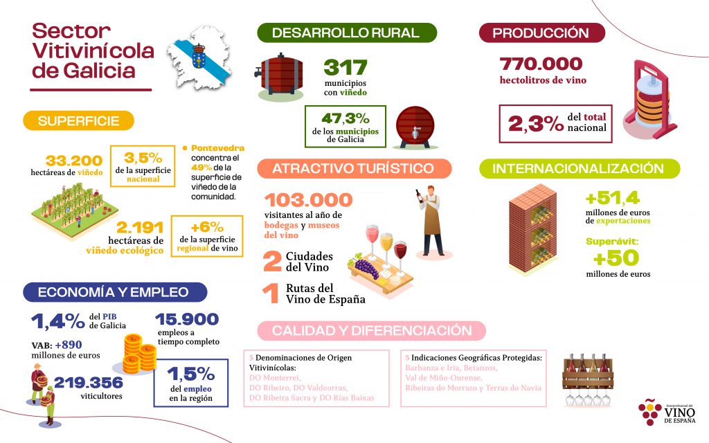 El sector vitivinícola está presente en 150 municipios gallegos, el 47,3% del total. La actividad vitivinícola aporta más de un 1,4% del PIB de Galicia y ayuda a mantener un 1,5% del empleo en la comunidad