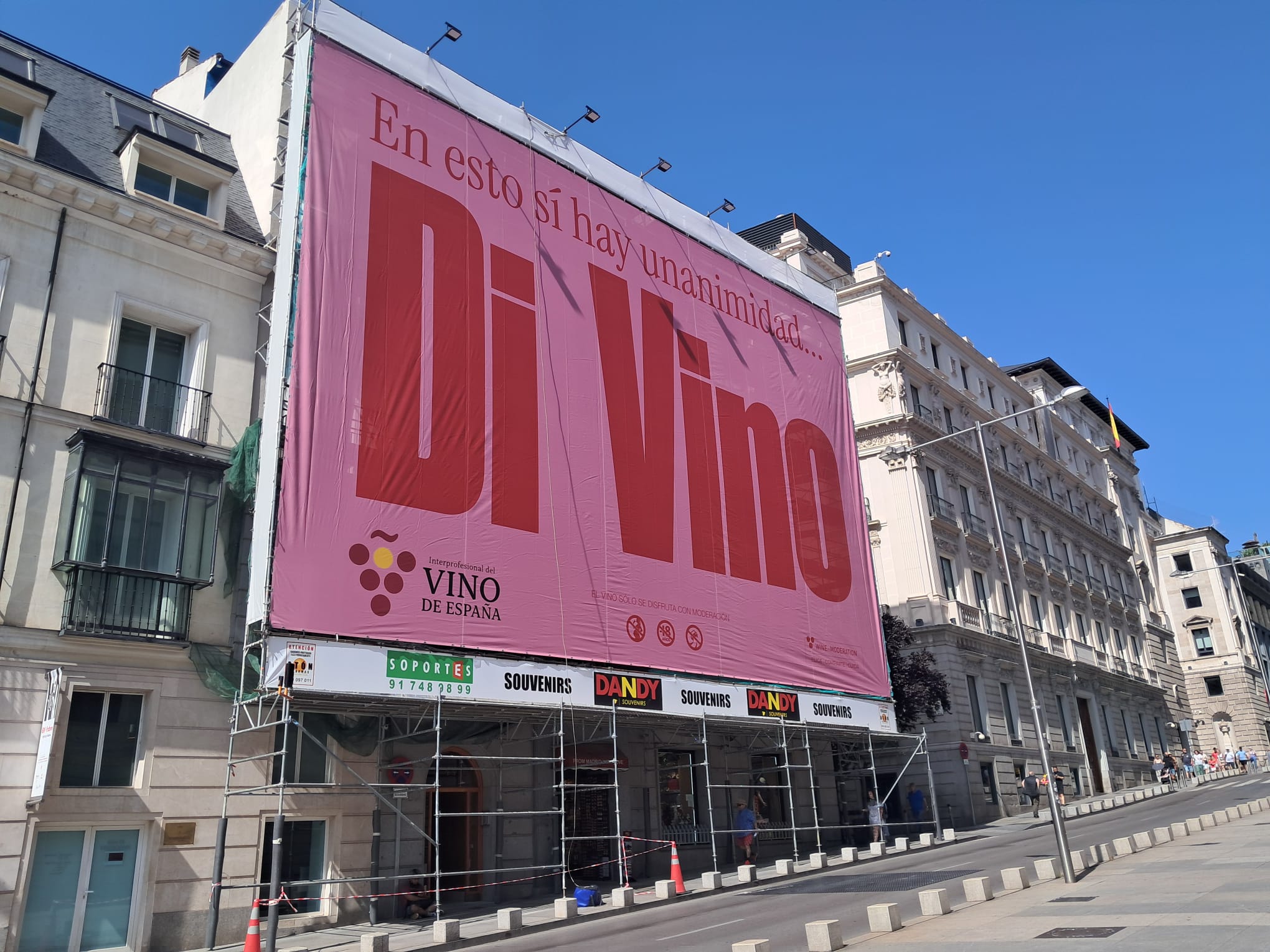 Frente al Congreso de los Diputados, en la céntrica Carrera de San Jerónimo, la Interprofesional del Vino de España (OIVE) ha desplegado una lona de 20 metros de largo por 13 de alto con un mensaje rotundo llamando a la unión en torno a la defensa de sector bajo el lema “En esto sí hay unanimidad. Di Vino”.